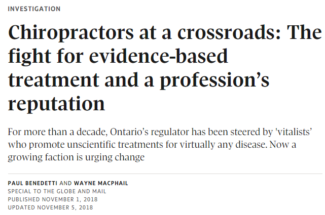 - An investigative report published in the Globe and Mail highlighted my efforts against false and misleading claims within the chiropractic profession in Ontario. The article spawned a follow-up, as well as some thoughtful letters to the editor.